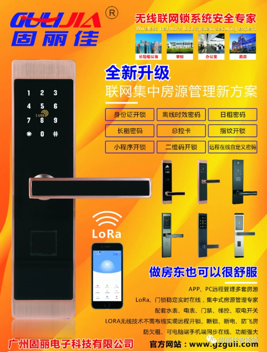 無線聯(lián)網鎖,開鎖信息實時聯(lián)網監(jiān)控、可手機開鎖,二維碼開鎖,不需布線可實現(xiàn)遠程開鎖,斷鎖,斷電,防飛房,防欠租,可對接PMS收銀管理系統(tǒng),時刻統(tǒng)計營業(yè)收入、房租收入、商品消費、附加費的統(tǒng)計,查詢營業(yè)報表,包含項目、數(shù)量、均價、金額,還可辦理入住登記統(tǒng)計、房間統(tǒng)計、預訂統(tǒng)計,可身份證開鎖,電腦端手機端同步在線,隨時隨地管理!為什么越來越多的公寓、民宿安裝我們固麗佳LORA聯(lián)網智能門鎖呢?