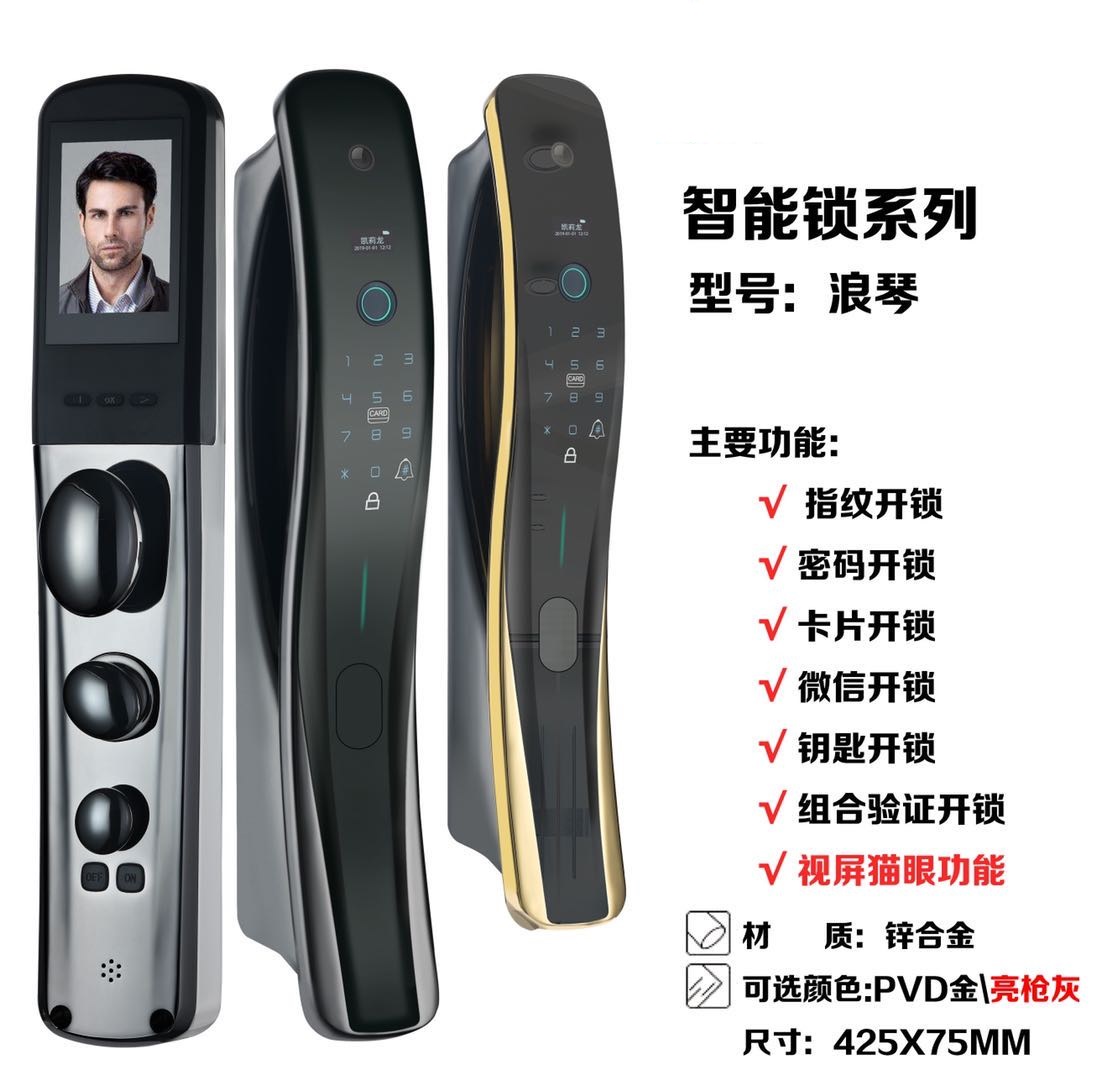 功能:指紋開鎖,APP遠程開鎖,密碼開鎖,微信開鎖,貓眼開鎖